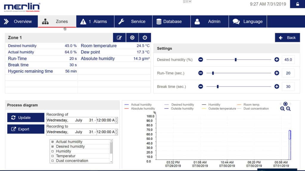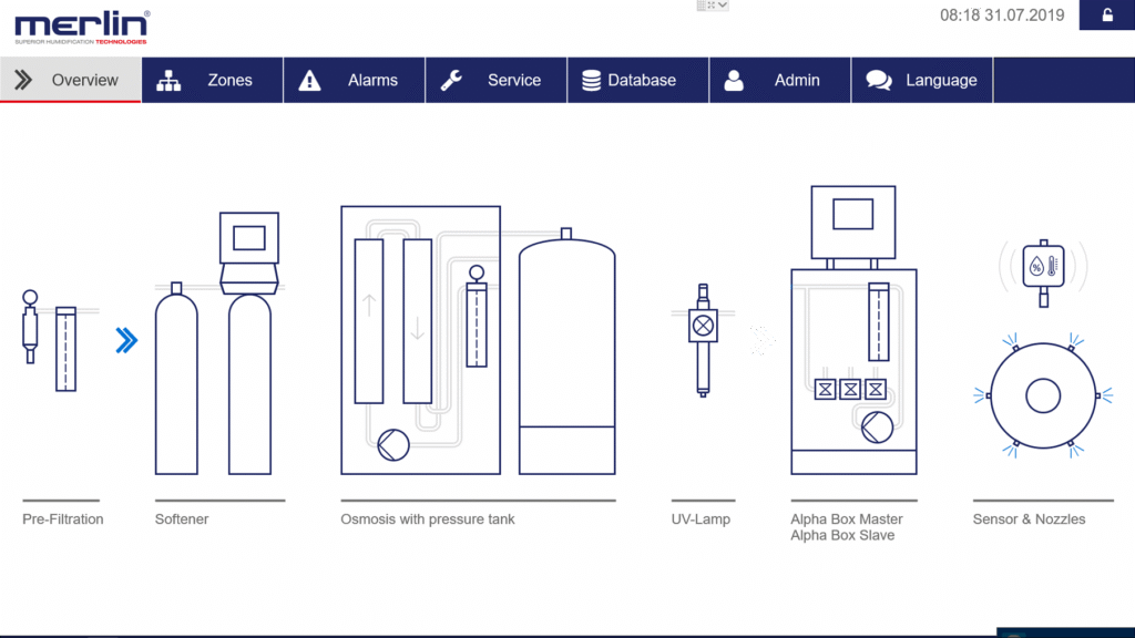 The Merlin Alpha room humidification system from MTG Eesti OÜ’s Austrian partner Merlin Technology GmbH is designed for humidifying the indoor air of larger production buildings, warehouses, office buildings, shops, etc. Alpha allows you to divide larger production areas or different parts of the building (rooms) into different zones. This ensures that the humidity of each zone (room) is in accordance with the optimal humidity level for each zone (room).