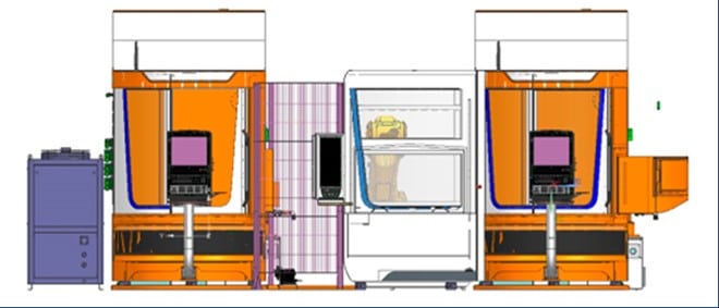 Linking of two HELITRONIC POWER DIAMOND 400 with one robot loader 25. The presented solution enables: